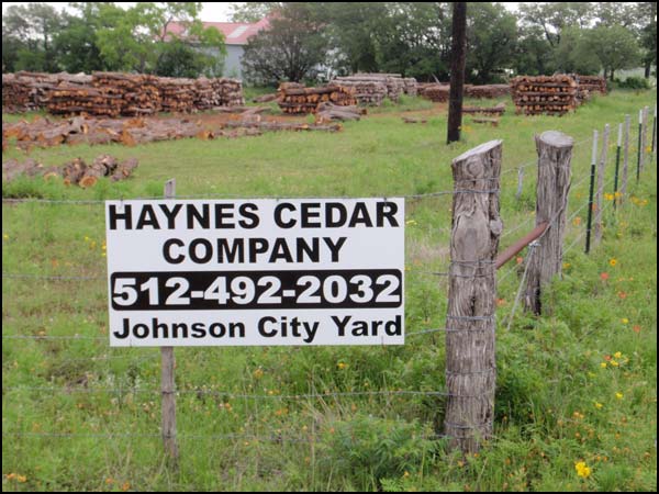 Haynes Cedar Yard is located about 1.5 miles west of Johnson City on HWY 290 - heading towards Fredericksburg, Texas. Call one day ahead of time for an appointment - we are not always there - lots of time everyone is out in the woods cutting more cedar! |